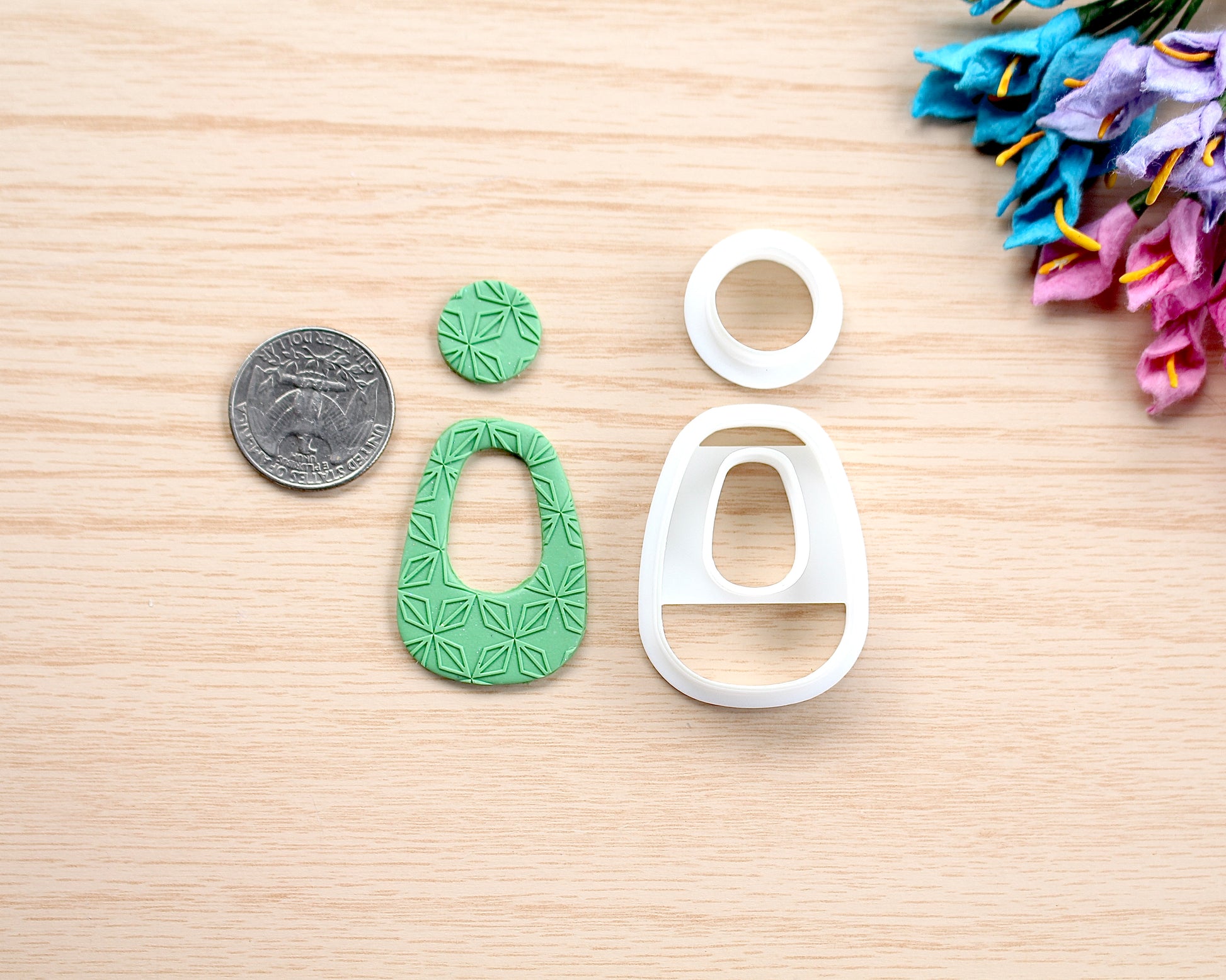 Sizes mentioned in the description are measured from top to bottom of the inner side of the cutters when put in the normal position like in the pictures (unless noted otherwise). I have a quarter coin included in the pictures as a reference, please check carefully. Personally, I find that the Large (L) size is suitable for large dangle earrings, fridge magnets, keychains, … The Small (S) size suits small dangle earrings, large stud earrings, pushpins, ... The Mini (XS) size is suitable for small stud earrings, or for putting on a bigger slab base to cut out for different things. Again, this is a totally personal preference - just sharing. If you want any different sizes of any cutter, please just send me a message, and I will see what I can do to accommodate you.